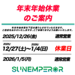 12月 16, 2025 / 最終更新日時 : 12月 18, 2025 sunadmin ニュース 年末年始休業のお知らせ 年末年始休業についてのお知らせです。 誠に勝手ながら、下記日程を休業とさせていただきます。 2025年12月27日(土)〜2026年1月4日(日)