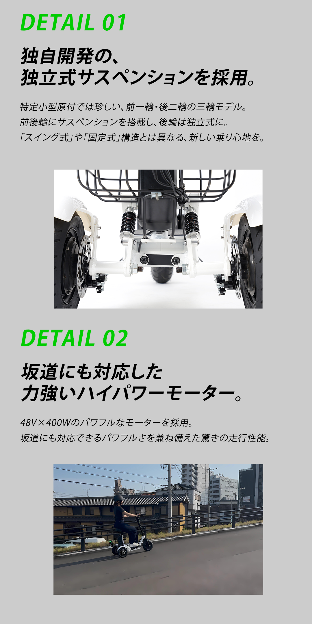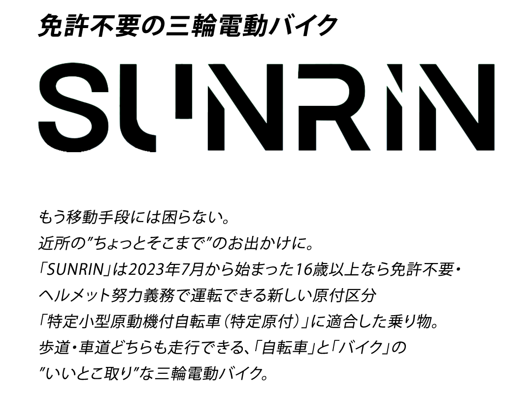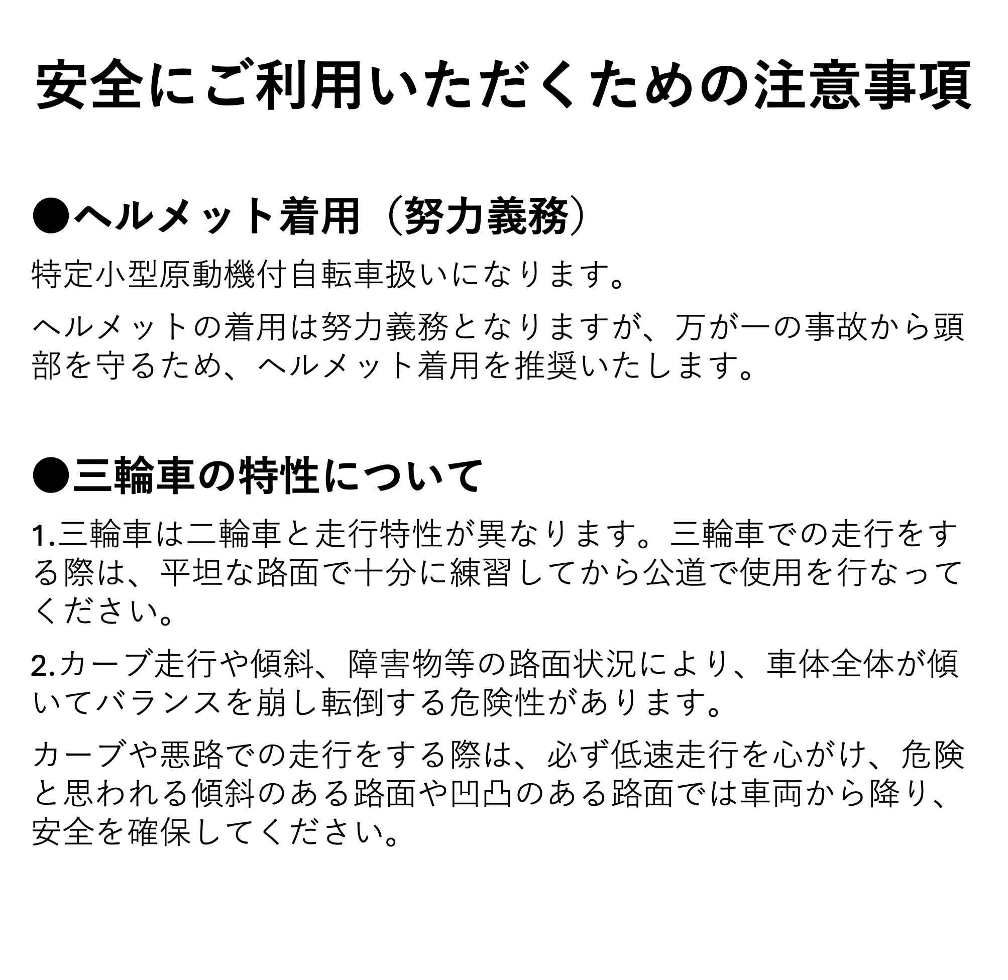 三輪車は二輪車と走行特性が異なります。三輪車での走行をする際は、平坦な路面で十分に練習してから公道で使用を行なってください。